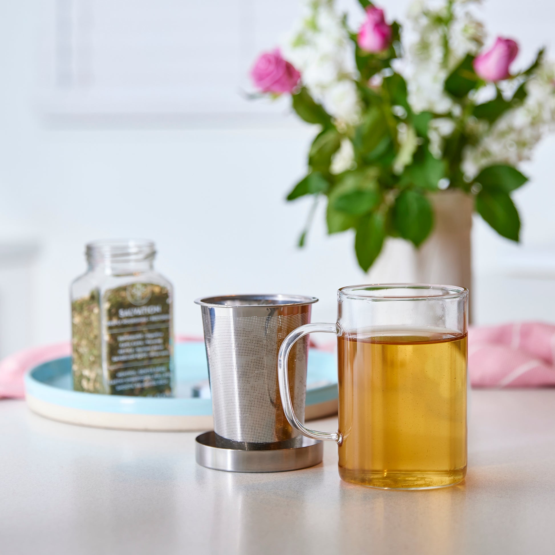 Our signature glass tea cup + infuser makes loose leaf brewing easy for everyday wellness.