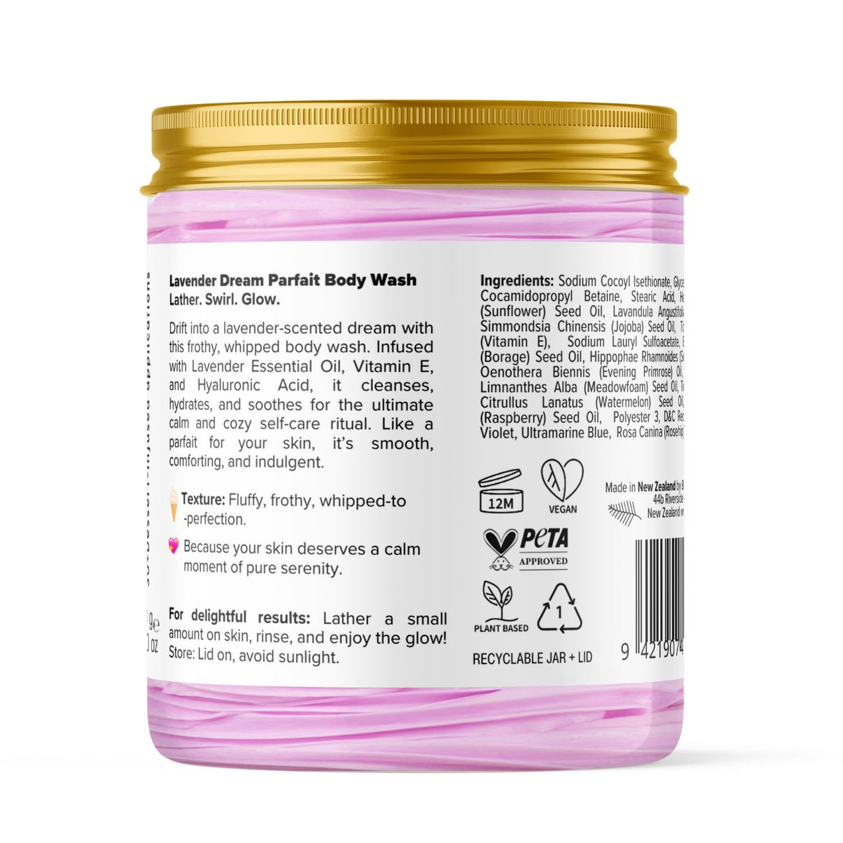 Inspired by a lavender-infused parfait, it blends relaxing floral notes with a silky, whipped texture for the ultimate comforting cleanse. The light, airy lather melts onto skin, delivering deep hydration while surrounding you in a calming aromatic escape.