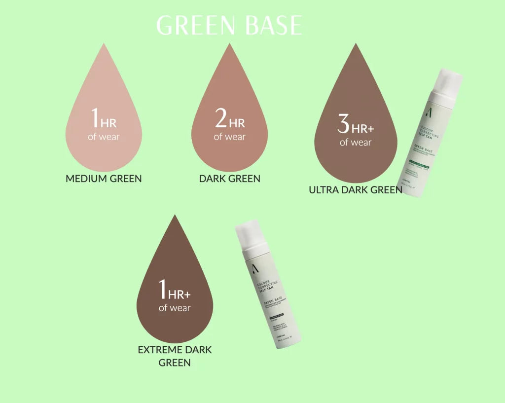 Azure Tan Green Base Mousse is a colour correcting tan to neutralise pink/red undertones for an olive brown tan. This product also doubles as a skincare treatment for the body to help fight signs of ageing and leave the skin hydrated and nourished.