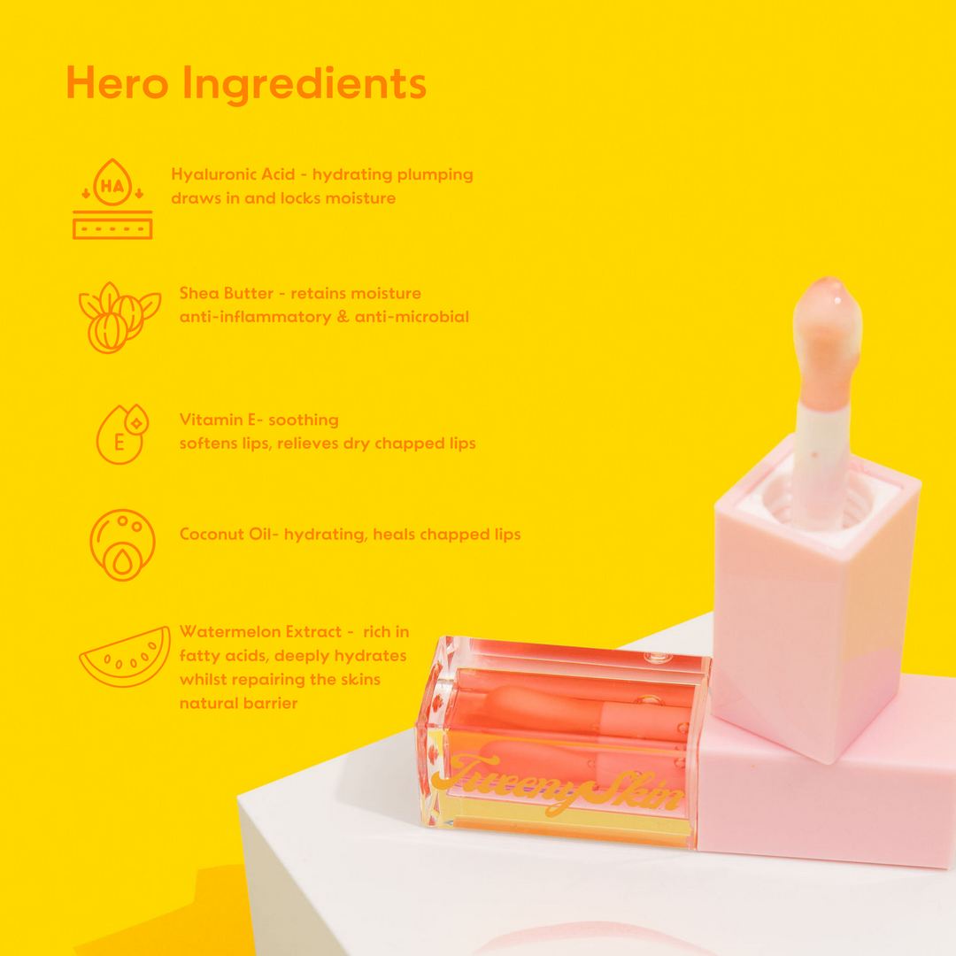 Ethylhexyl Isopalmitate, Octyldodecanol, Ethylene/propylene/styrene Copolymer, Polyisobutene, Hyaluronic Acid, Cocos Nucifera (Coconut) Oil, Argan oil, Butyrospermum Parkii (Shea Butter) Vitamin E, Vanilla Butyl Ether, Watermelon Extract, Capsicum Annuum Fruit Extract, Ginger Extract, Food Colour, Red 7 Lake (Ci 15850)